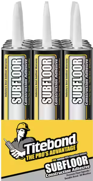 Titebond PROvantage Subfloor Construction Adhesive is a professional strength formula that is specifically designed for subfloor installations and general plywood use. It provides a permanent bond that remains flexible, reduces nailing and prevents squeaky floors. It offers a strong initial tack and excellent bond strength. It is covered under the 25-Year Silver Subfloor Warranty against subfloor squeaks and pops.
