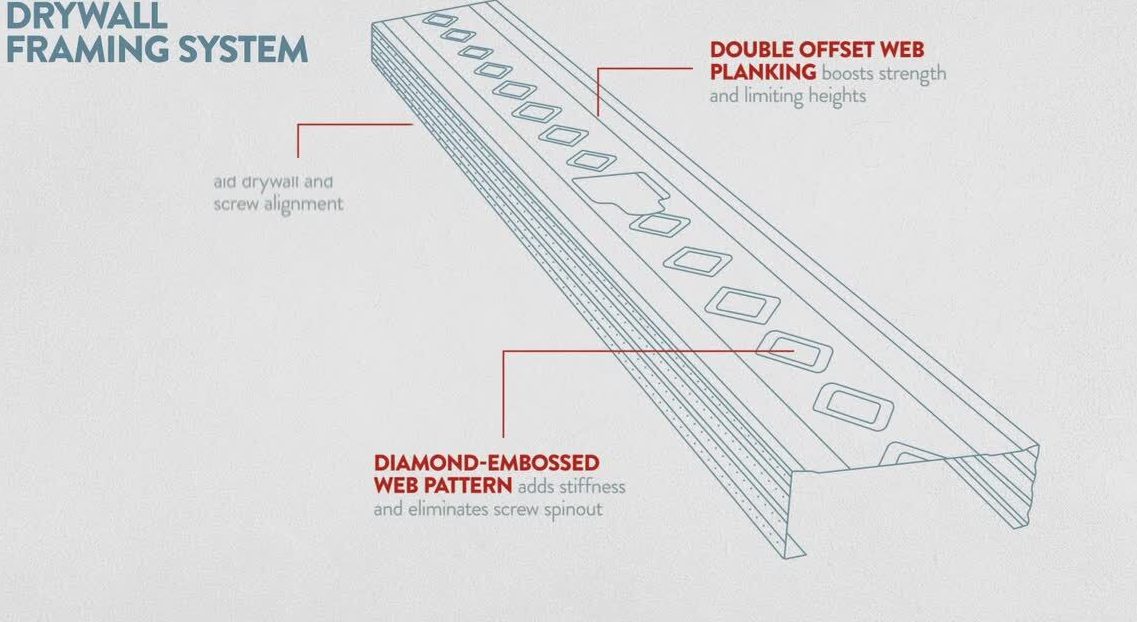- Diamond embossed web creates stiffness, reducing flange fade and screw spinout during drywall installation